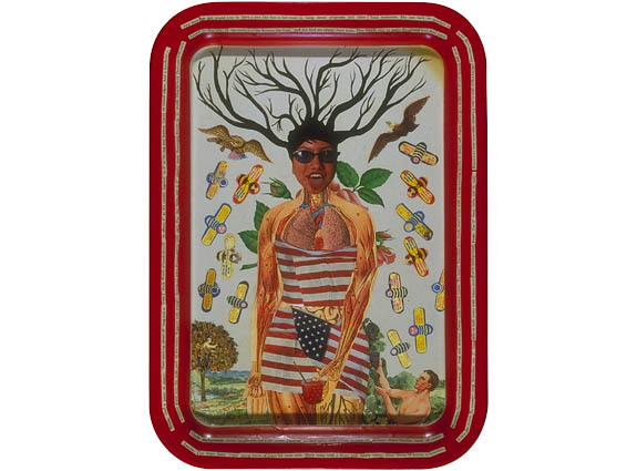 Acrylic, collage and varnish on recycled tin TV tray
